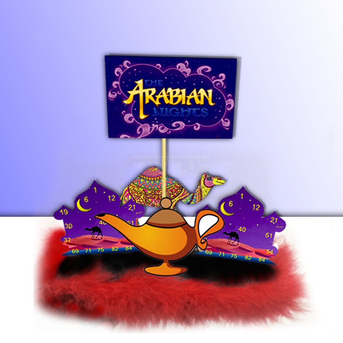 Description- Enjoy a special and a memorable round of tambola in your Arabian Nights theme kitty party with these lovely Arabian Nights theme 3D handmade tambola tickets designed especially for your Arabian Nights theme kitty party. These lovely handmade tambola tickets have beautiful cutouts related to Arabian Nights theme assembled in 3D fashion over a base decorated with fur. There are two mosque shaped cutouts having tambola numbers printed over them arranged over the base. These two mosque cutouts with numbers serve as two tambola tickets which either could be used by a couple (one for each) or a single player can play with two tickets as per the desire of the host. Accordingly the numbers could be divided into three separate dividends while interesting Arabian Nights theme related callouts could be used to add more fun to the party.