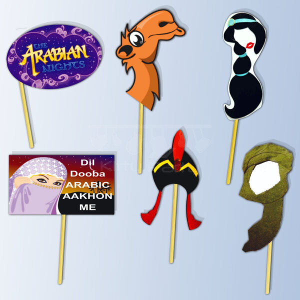 Items provided- Cool Arabian Nights theme shape cutout stick props designed keeping an Arabian Nights theme kitty party in mind.
