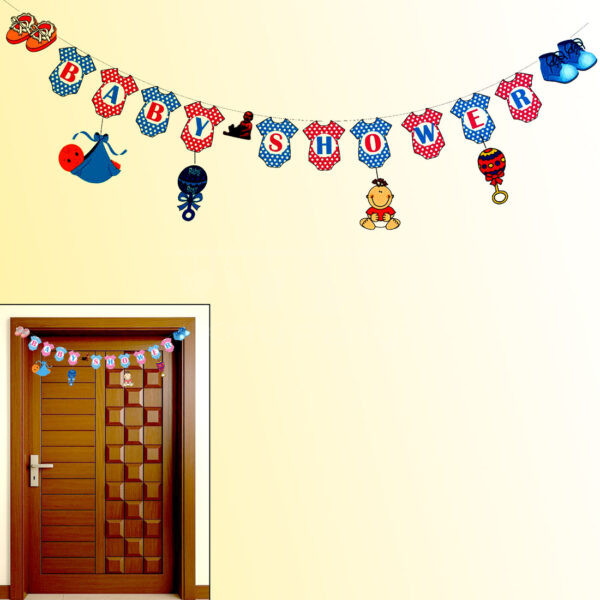 Description- Make the decorations of your baby shower look really adorable celebrating the arrival of your little one in a cute way with this beautiful handmade baby shower banner. It is a lovely banner with little cutouts of Baby Grows, rattles, a new born and the like hanging with a string. All these cute little cutouts are designed in pink and blue to keep in with the theme of baby shower. With ‘BABY SHOWER’ written over these cute cutouts, this baby shower theme handmade banner is just perfect to celebrate your baby shower party and make the party venue look more beautiful.