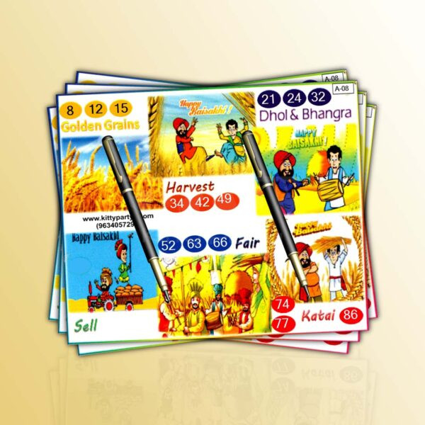 Items provided- Colorful Baisakhi theme printed tambola tickets designed especially for a Baisakhi theme kitty party.