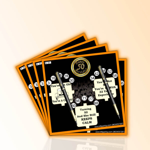 Items provided- Fun and stylish looking 50th birthday theme printed tambola tickets designed especially for a 50th birthday party.