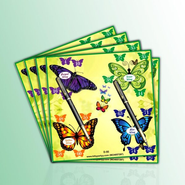 Items provided- Bright and beautiful butterfly theme printed tambola tickets designed especially for a butterfly theme kitty party.