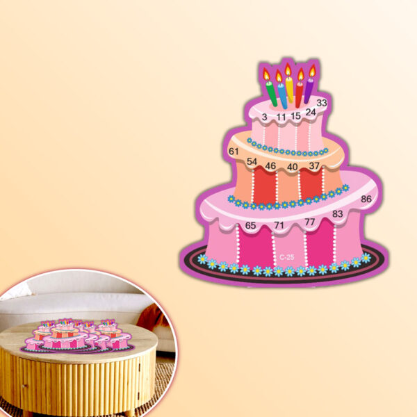 Items provided- Cute cake shaped printed tambola tickets designed especially for a birthday party.