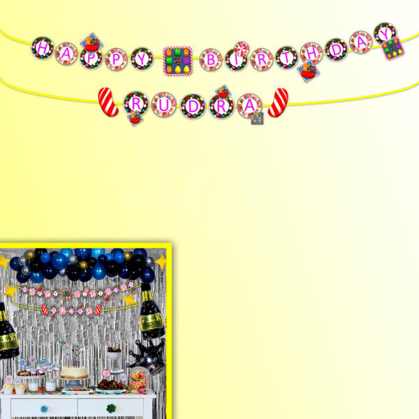 Description- Celebrate a special birthday in Candy Crush theme style. Decorate your birthday party venue with this funky and beautiful Candy Crush theme birthday banner customized especially for a Candy Crush theme birthday party. This handmade banner with the name of the birthday boy/girl and candies assembled together with a satin ribbon looks really innovative and would definitely add a special charm to the decoration of your Candy Crush theme birthday party.