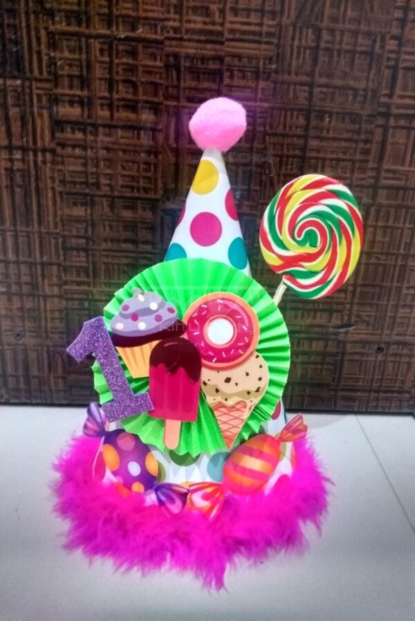 Items provided- Adorable and colourful candy land theme handmade special birthday cap designed keeping a candy land theme birthday party in mind.