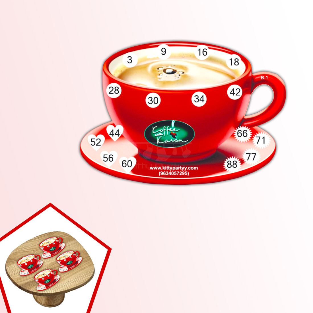 Description- Coffee with Karan is really an interesting and fun kitty party theme for all the coffee lovers. So, why not make your Coffee with Karan theme kitty party all the more fun and exciting with these Coffee with Karan printed tambola tickets. These special tambola tickets designed in the shape of a bright red colored coffee mug would make tambola really entertaining and memorable for your guests. The numbers are printed over these coffee mugs in four sections that are to be used as four separate dividends. Fun callouts related to the theme too could be used to ensure an enjoyable round of tambola at your Coffee with Karan theme kitty party.