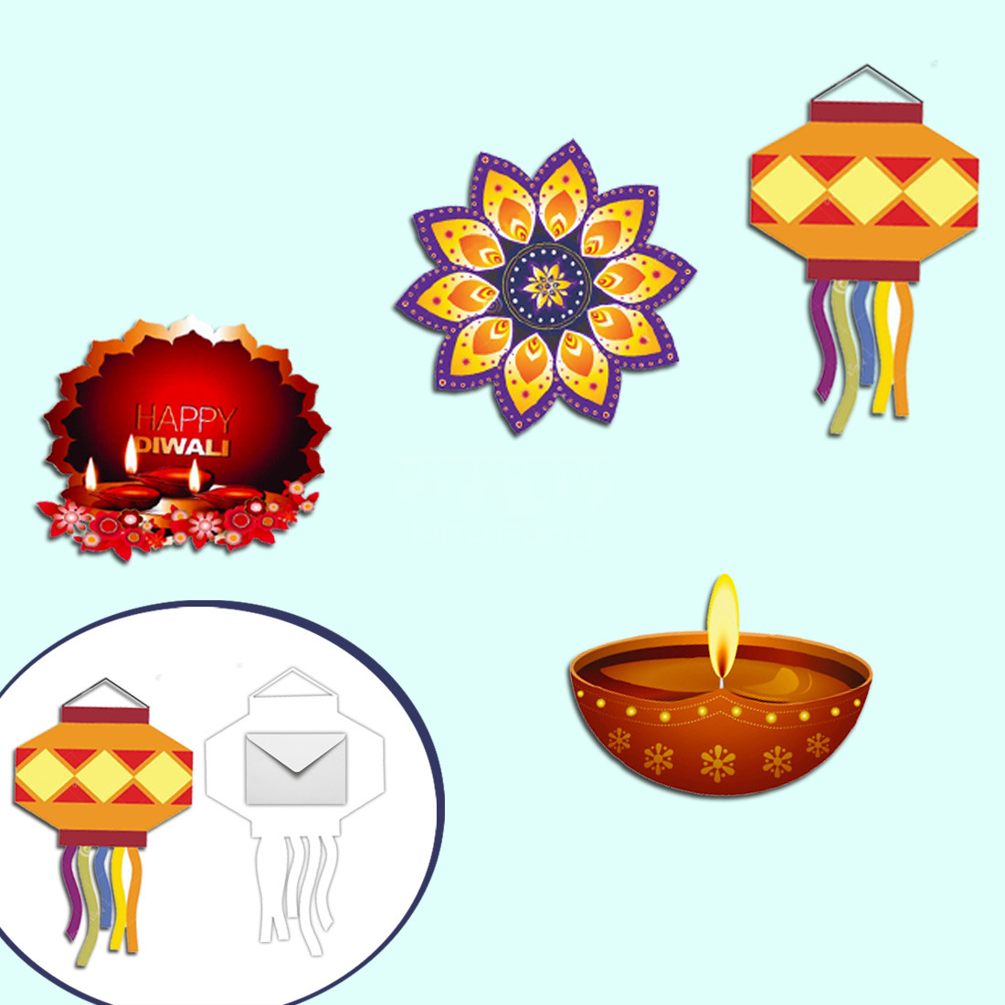 Items provided- Diwali printed shape envelopes made out of interesting cutouts of items related to Diwali designed especially for a Diwali theme kitty party.