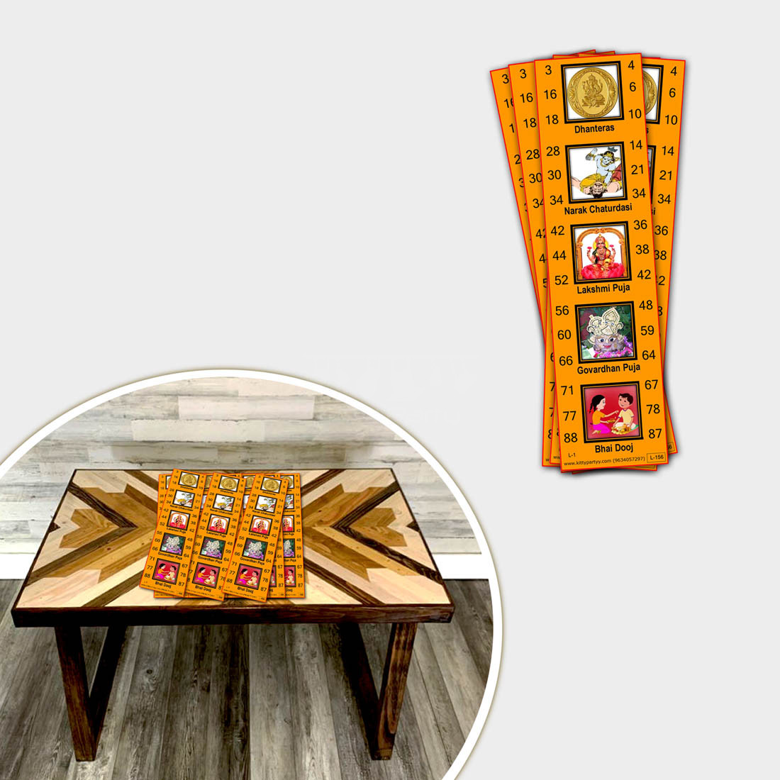 Description- Diwali festivity spans over five days starting from dhanteras and ending with bhai dooj. So, celebrate all these five days in s single tambola ticket by playing tambola with these special printed Diwali theme kitty party tambola tickets. It marks all the five day festivity like dhanteras, narak chaturdasi, lakshmi puja, goverdhan puja and bhai dooj . Each day’s festivity has one section with numbers printed and a corresponding relevant picture. These tickets are unique and attractive at the same time. So, make these tambola ticket a part of your Diwali theme kitty party celebrations and enjoy the festival.
