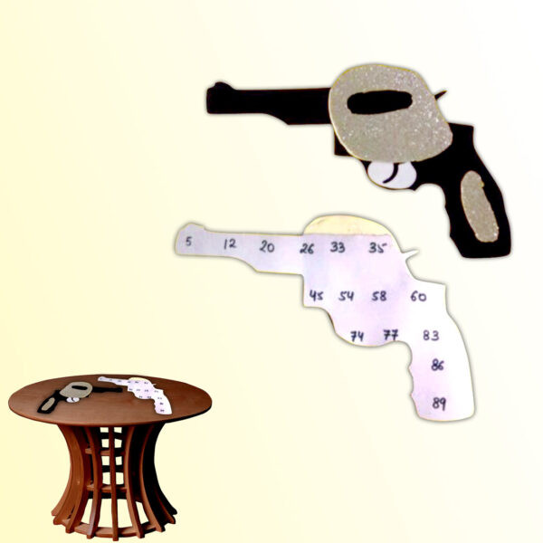 Description- Remember what fun it used to be to play with toy guns and act as cops and robbers during childhood. Keeping that childhood fun in mind, we bring these innovative and completely handmade gun shaped tambola tickets created especially for your cops and robbers theme kitty party. These special tambola tickets are designed in the shape of glittery guns that are sure to jazz up your tambola round. The numbers are written at the back side of the tickets in three sections. These three sections are to be used as three separate dividends while fun callouts too could be used to make the tambola round more interesting.