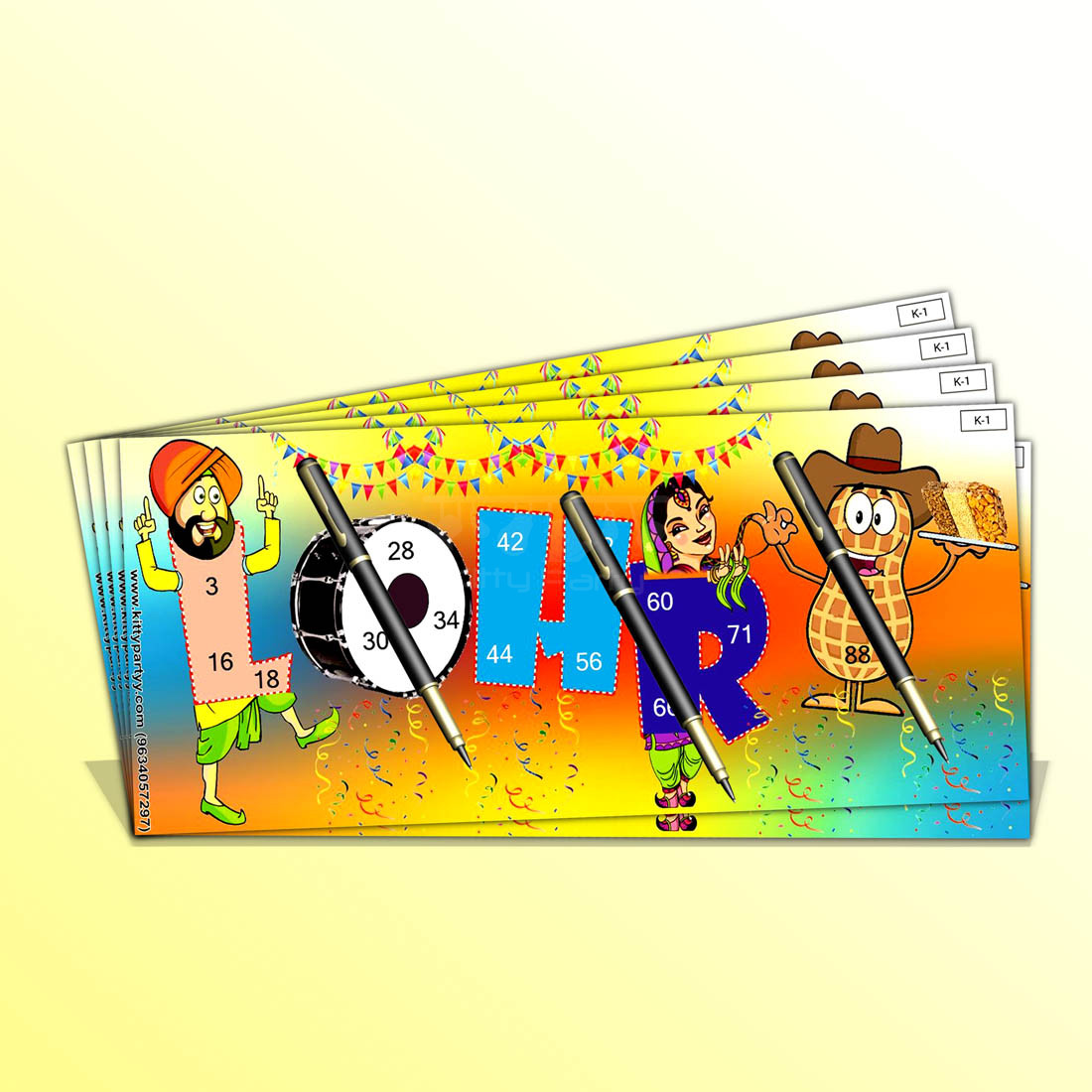 Items provided- Colorful happy Lohri printed tambola tickets designed keeping a Lohri theme kitty party in mind.