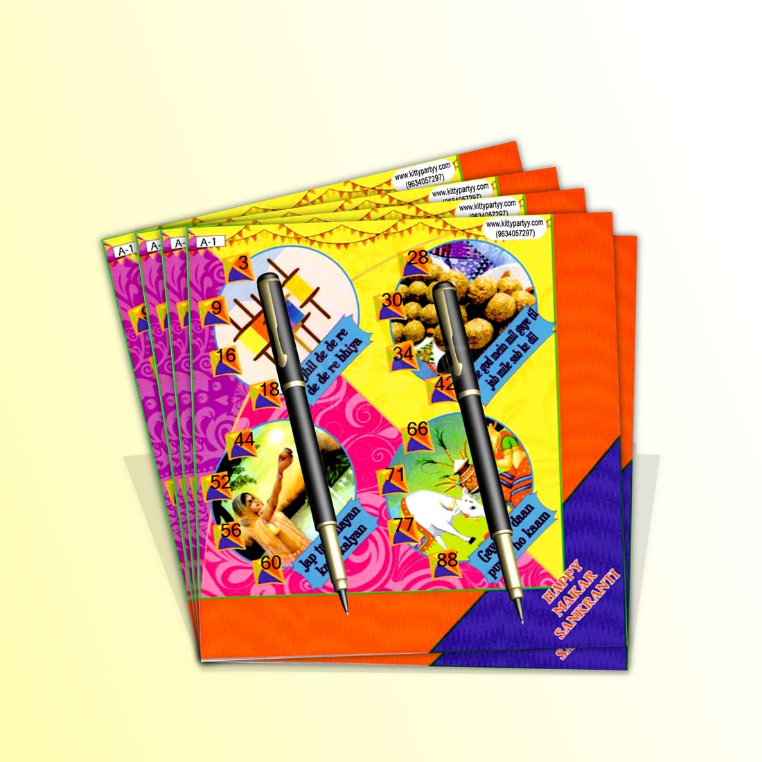 Items provided- Special Happy Makar Sankranti printed tambola tickets designed keeping a Makar Sankranti theme kitty party in mind.