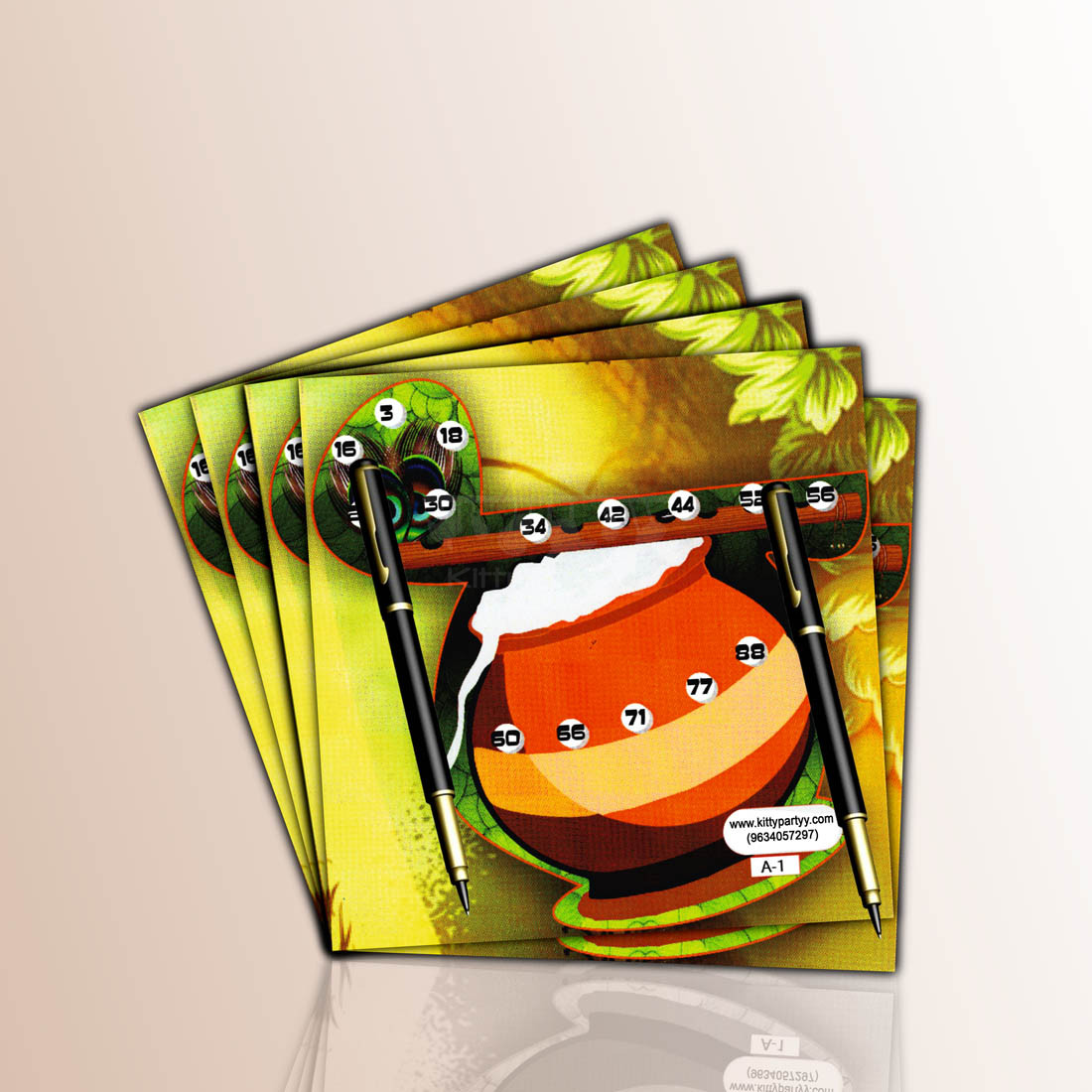 Description- A fun part of Krishna Janamasthtmi is the breaking of Janamasthtmi matki which is a part of the festivity and the people participate in it with great zeal. Bring the same zeal and excitement in your Janamasthtmi theme kitty party by playing an innovative round of tambola over these printed Janamasthtmi matki tambola tickets designed especially for your Janamasthtmi theme kitty party. These printed tambola tickets have a beautiful picture related to Krishna Janamasthtmi printed over them. The picture includes a makhan matki, a murli (flute) and a peacock feather attached to the flute. There are five tambola numbers printed over each motif. Each of these three Janamasthtmi motifs are to be treated as three separate dividends while the host may use some interesting theme related callouts also to make the kitty party a memorable one for all the guests present.