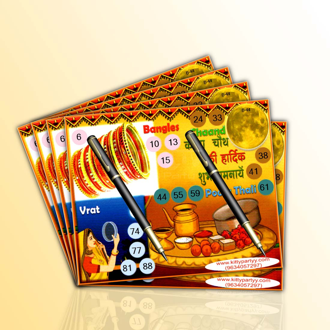 Items provided- Printed karwachauth tambola tickets designed especially for a karwachauth theme kitty party.