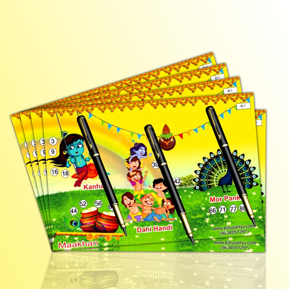 Items provided- Colorful and vibrant Krishna printed tambola tickets designed especially for a Janamasthtmi theme kitty party.