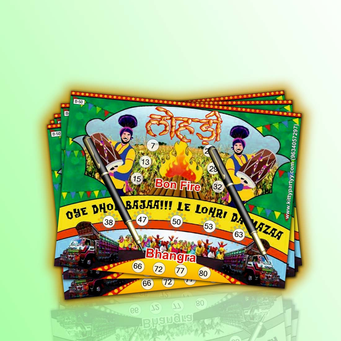 Items provided- Funky looking Lohri theme printed tambola tickets designed especially for a Lohri theme kitty party.