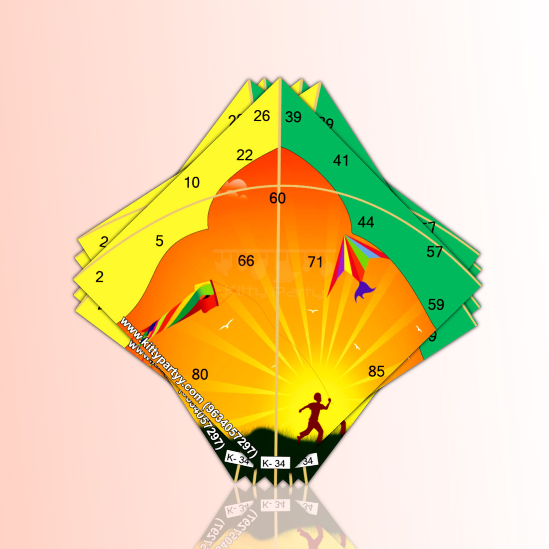 Description- You all must have enjoyed flying colorful kites on Makar Sankranti. Bring this fun into your Makar Sankranti theme kitty party also with these printed Makar Sankranti kite tambola tickets. These special tambola tickets are made in the shape of a kite and are divided into three sections of three different colors. Each section has some tambola numbers printed over it. The three sections are to be considered as three separate dividends while the color filled in each section could be used as its callout. So, enjoy playing a special round of tambola at your Makar Sankranti theme kitty party with these fun kite shaped tambola tickets.