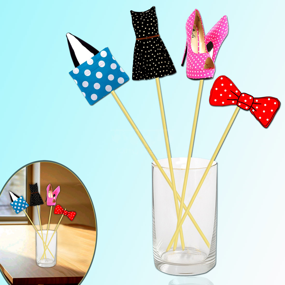 Description- Give a special touch to the decorations of your polka dots theme kitty party venue with these special polka dots theme center table decorations. These beautiful handmade center table decorations which are designed keeping a polka dots theme kitty party in mind look really pretty and would add a special charm to the decorative part of your kitty party. These center table decorations made with funky cutouts of items and accessories designed in polka dots pattern pasted over sticks look very beautiful. So, decorate the party hall with these special center table decorations at your polka dots theme kitty party and make it more appealing for your kitty mates.