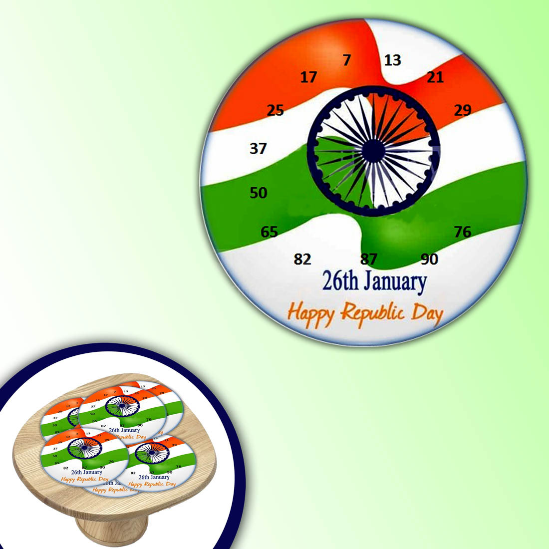 Items provided- Innovative Republic Day round flag shaped printed tambola tickets designed keeping a Republic Day theme kitty party in mind.