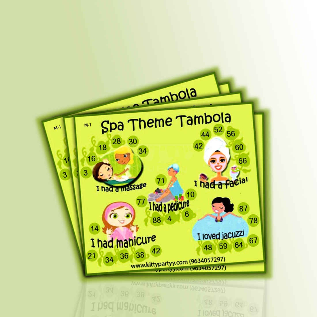 Items provided- Cool Spa theme kitty party printed tambola tickets designed keeping a Spa theme kitty party in mind.