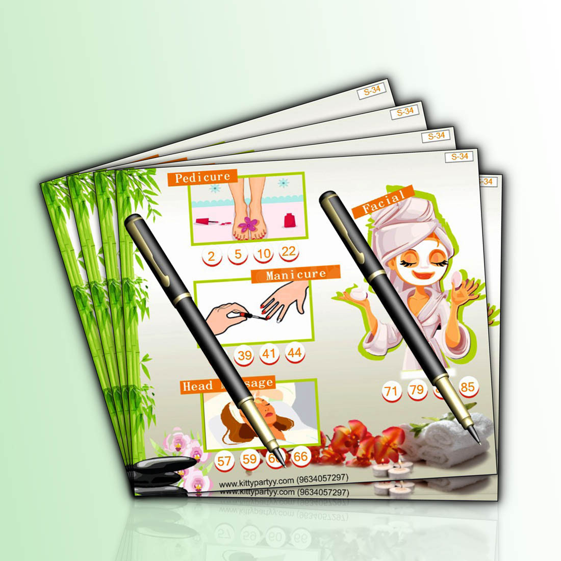 Items provided- Funky Spa theme kitty party printed tambola tickets designed especially for a Spa theme kitty party.