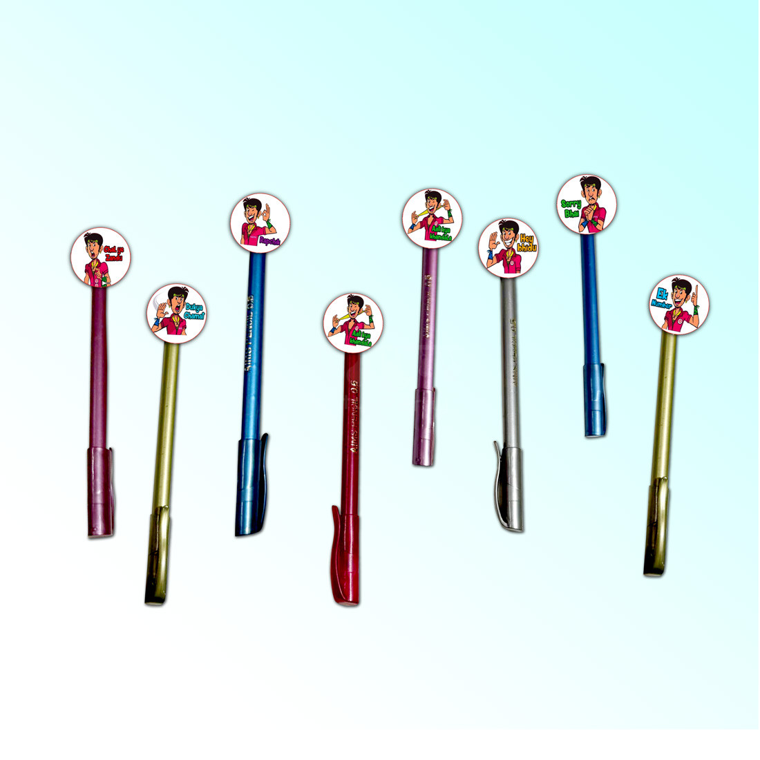 Description- Planning to throw a tapori theme kitty party? Make it more fun and special by using these cute looking tapori theme pens customized especially for a tapori theme kitty party. These pens have cute cutouts of pictures related to the tapori theme pasted over the lower ends of these pens. So, use these tapori theme pens as special party props in your party and play tambola and other paper games with these customized pens in your tapori theme kitty party.