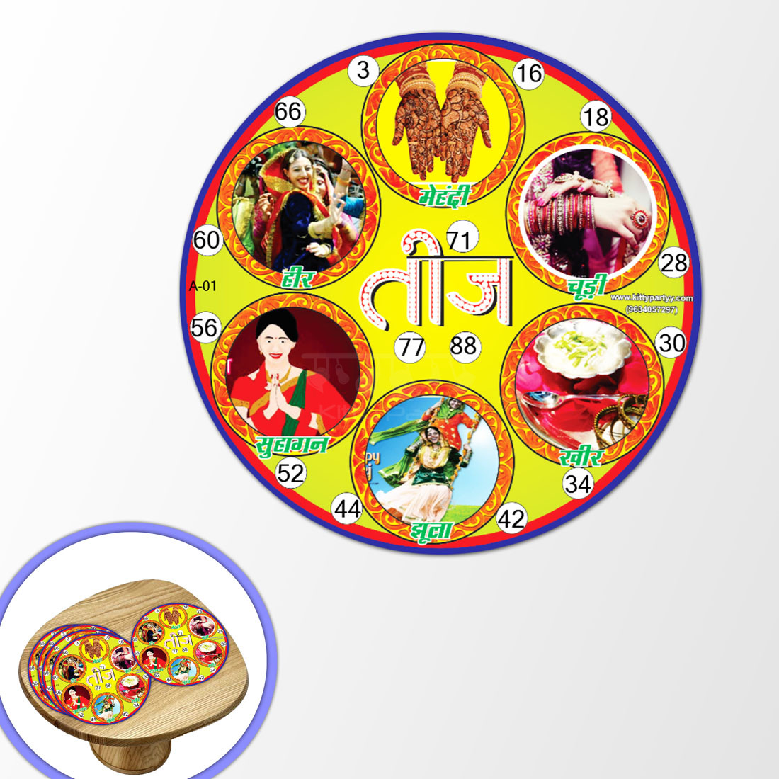 Description- Enjoy a fun round of tambola in your Teej theme kitty party with these vibrant Teej theme kitty party printed tambola tambola that would definitely make for an entertaining round of tambola at your kitty party. These printed tambola tickets are circular in shape and have pictures depicting the festival of Teej printed in a beautiful circular pattern. Each picture has two tambola numbers printed along with it while there are three tambola numbers given in the middle part of the ticket. These six pictures and the middle section of the ticket are to be considered as seven separate dividends while the picture captions given along with each picture could be used as the callouts. So, play a thoroughly enjoyable round of tambola at your Teej theme kitty party with these tambola tickets and make it more memorable.
