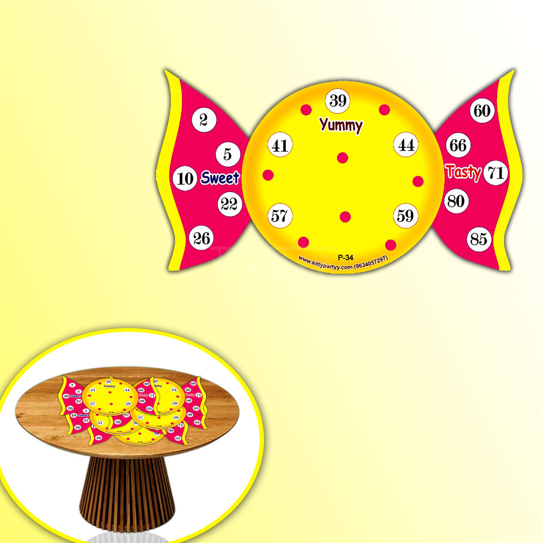 Items provided- Cute and colorful toffee shape cutout printed tambola tickets designed for your candy crush theme kitty party.