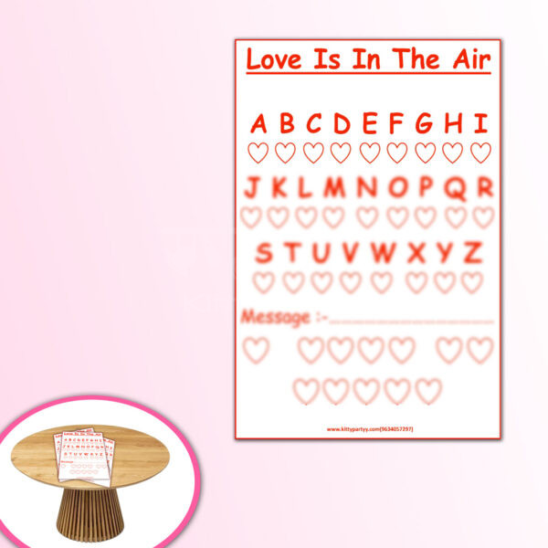 In this one minute paper game, each participant would be provided with a printed play sheet to play the game. On the play sheets all the 26 alphabets of English are printed and an empty heart is given below each alphabet. After distributing the sheets among the participants, the host would ask the participants to fill the empty hearts given below the alphabets with numbers ranging from 1 to 26 depending upon their choice such that each alphabet is marked with one number ranging from 1 to 26. After that the host would ask the participants to exchange the sheets among themselves. Then, the host would provide the participants with a Valentine’s message of his or her choice and ask the participants to write it in the message column. The length of the message should match the number of empty hearts given below the message column.