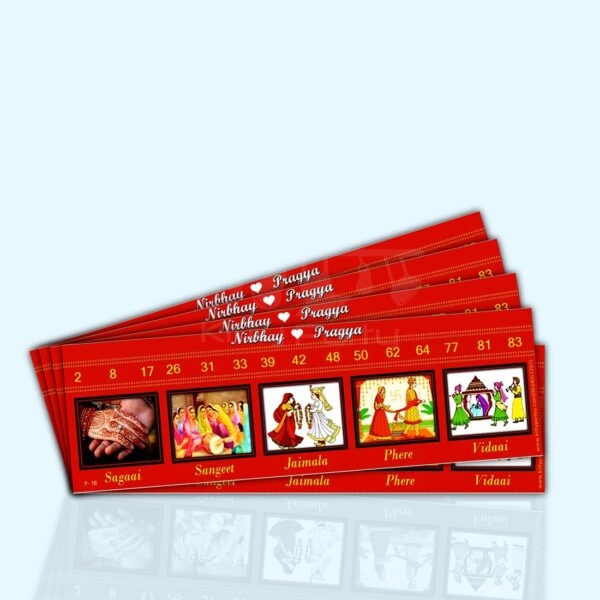 Description-Indian weddings involve grand and elaborate celebrations right from engagement to the main wedding day. So, let us play tambola in Indian wedding style in your wedding theme kitty party and make it as fun and as enjoyable as an Indian Wedding. This printed tambola ticket is divided into five sections based on the ceremonies that form a part of an Indian wedding right from Engagement to the wedding day. There are three numbers printed in each section along with a picture relevant to the ceremony depicted in that section.