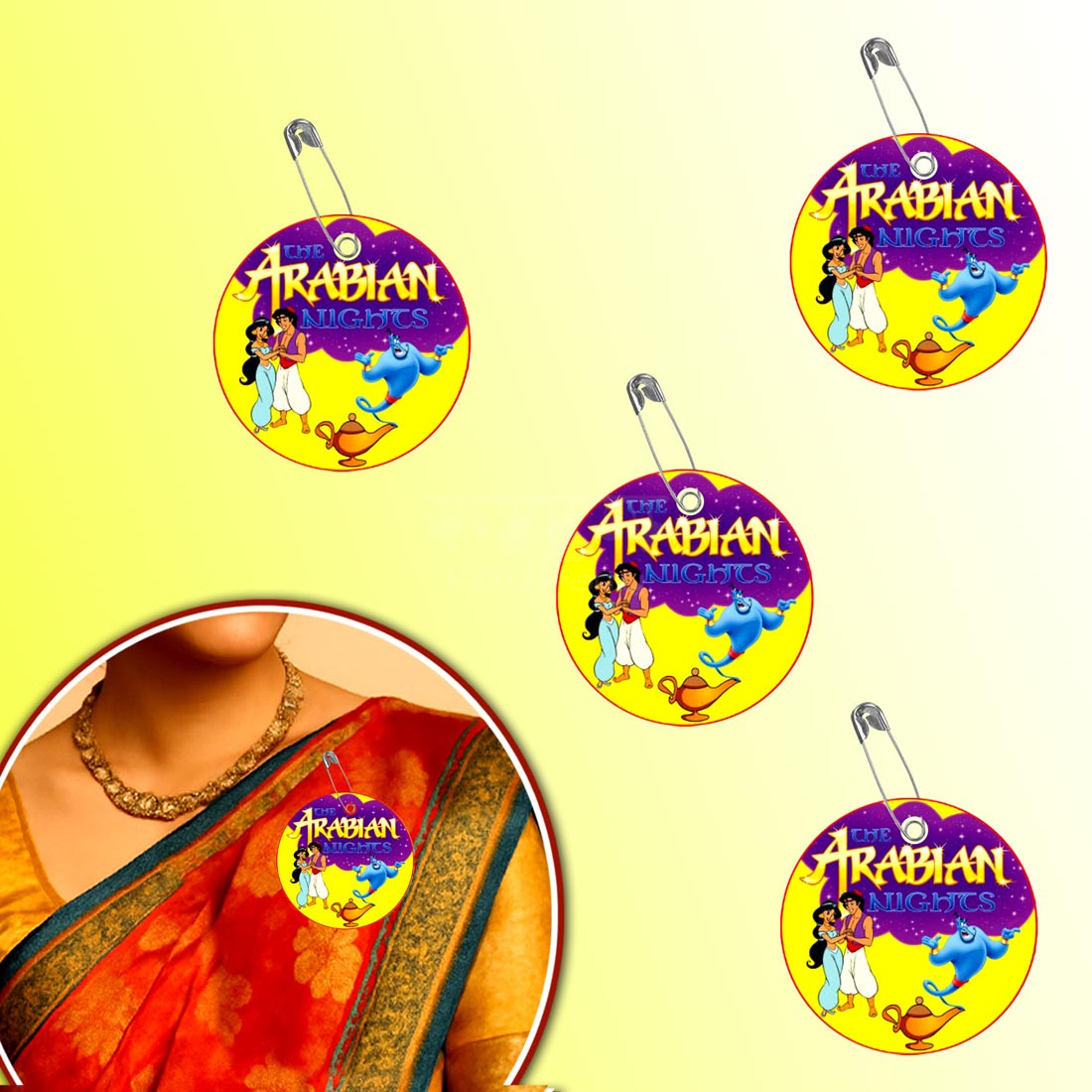 Description- Welcome your guests to the fantasy world of Arabian Nights with these special ‘Welcome to Arabian Nights’ badges created keeping an Arabian Nights theme kitty party in mind. These cute badges in the form of circular cutouts have the main characters of Arabian Nights i.e. Aladdin, Jasmine and the genie printed over them and they work as cute welcome props for an Arabian Nights theme kitty party. These welcome badges have safety pins attached to each of them that are to be used to affix these badges on the attires of the guests as they enter the party hall. So, make these lovely ‘Welcome to Arabian Nights’ badges a part of your Arabian Nights theme kitty party and welcome your kitty mates in style.