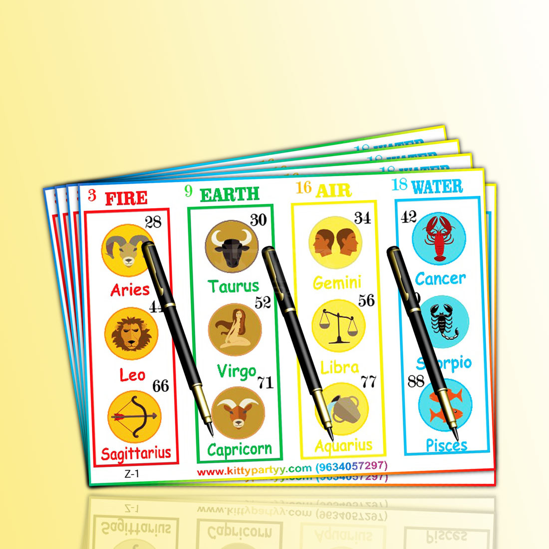Items provided- Funky and fun zodiac sign printed tambola tickets designed especially for a horoscope theme kitty party.